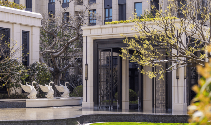 园林景观:百年朴树、松竹梅“岁寒三友”雕塑、铜鹤水景构成东方诗意空间,非简单绿化,而是“可漫步的园林艺术”;