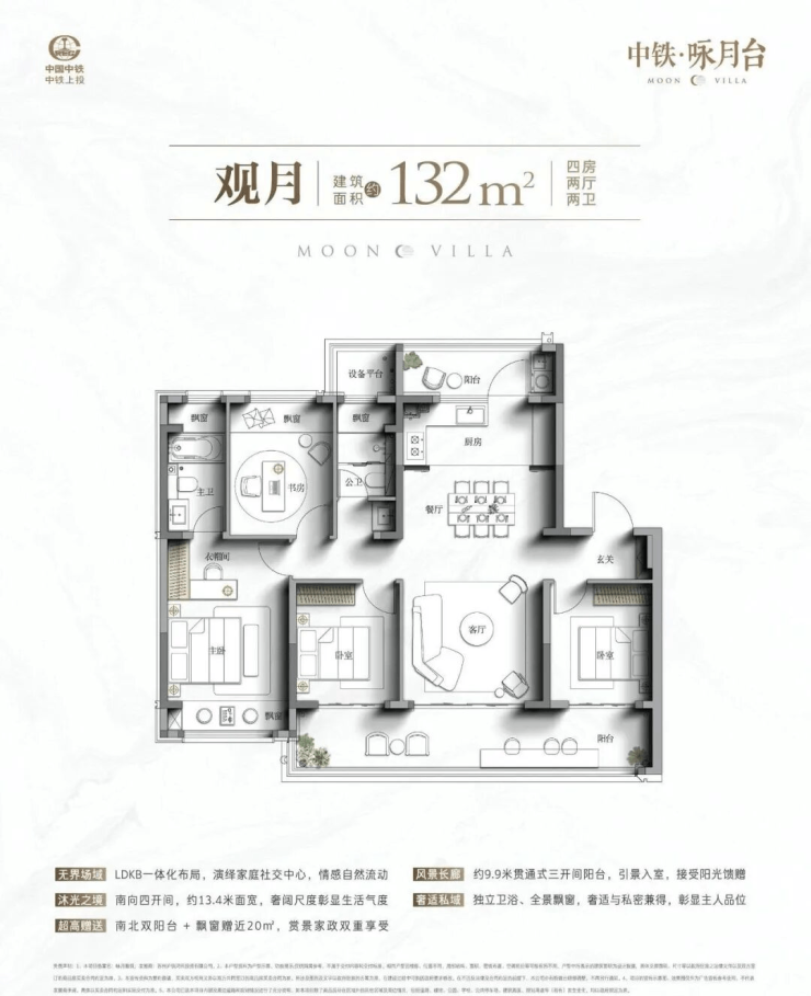 约132㎡宽境洋房:四房两卫,南向面宽约13.4米,赠送近20㎡,得房率高