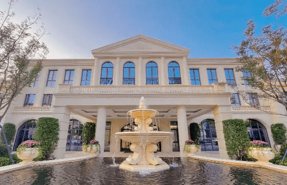 外立面:全石材干挂+香槟金铝板,雕花廊柱、斜坡屋顶、门廊雕花等细节复刻枫丹白露宫元素,工艺难度达毫米级,保留建筑厚重的品质感。