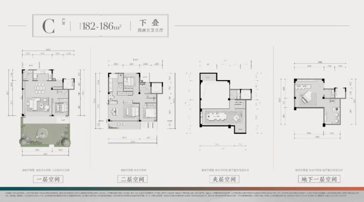 186㎡下叠:四室两厅四卫,赠送约60㎡庭院+6米层高地下室,可做夹层拓展空间,双主卧设计