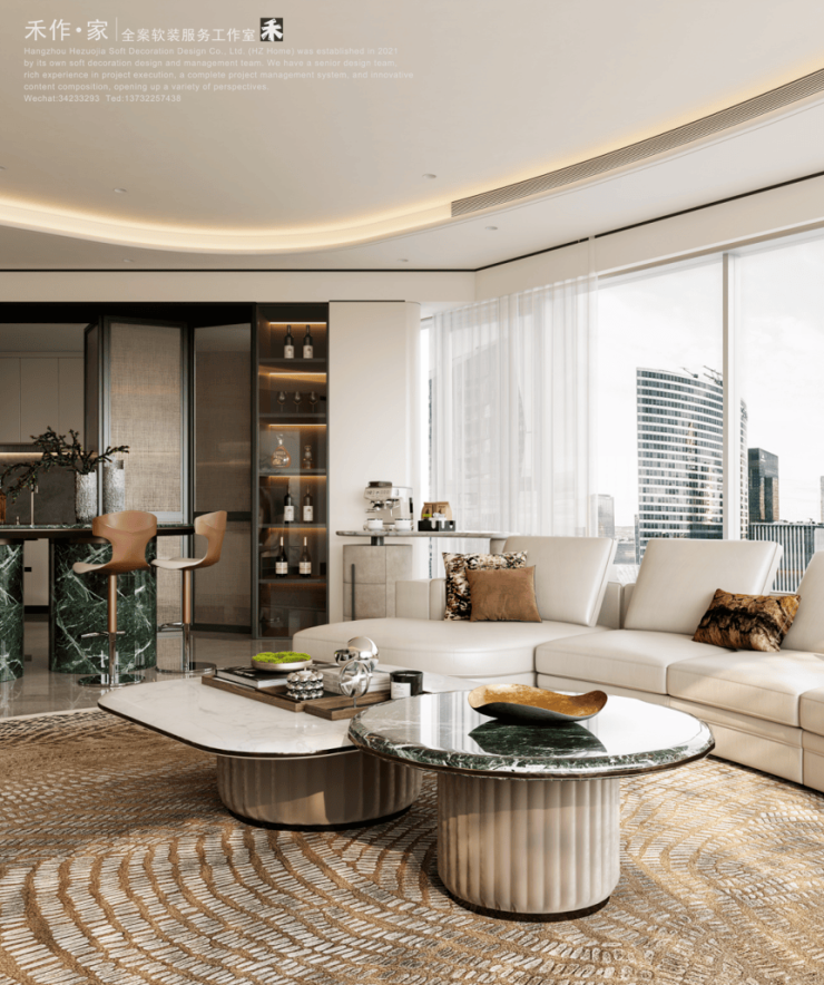 将艺术感进一步融入日常中。特别设计的专属门厅空间,是从电梯厅延伸到家,如同一处艺廊,放慢人的情绪;室内选用了浅金色奢石(外界也称其为“芬迪白大理石”)作为主要的石材,曲面的木饰面也为浅色,整体给人以明亮感。