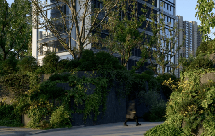 走入T-ONE潮博西区的园区,可以看到一条蜿蜒的水系串联着不同场景,贯穿整个楼盘。在这里,Pok是结合了杭州「钱塘江潮」的在地文化,用溪流与叠水打造出了一座很有度假感的花园。花园中,凡是有户外座椅的地方,就会有微风、树荫与水流的环绕。