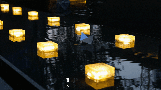 城市的喧嚣在这一隅园林中被沉淀,天色低垂,一池澄澈水面映衬着水乡的灯火通明,设计将夜幕中的灯火点缀在景池中,如江南繁华初绽,繁星摇曳。