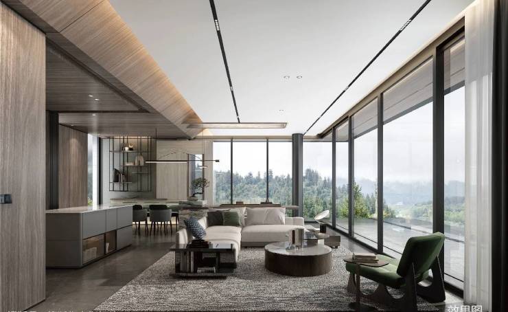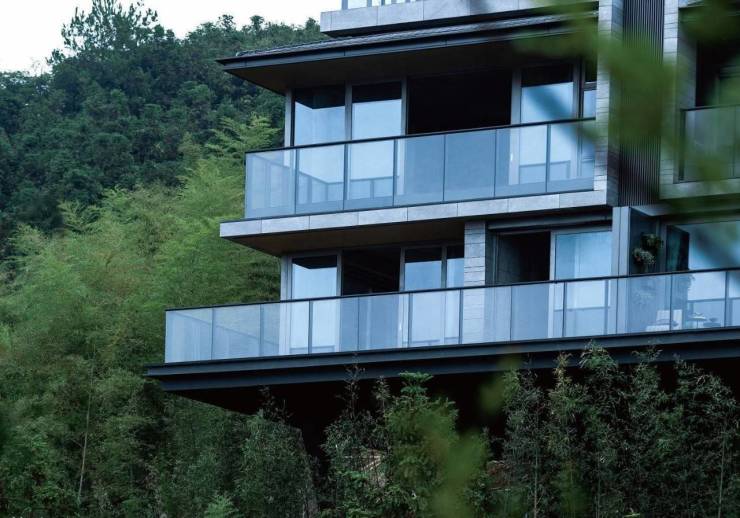 玻璃山墅依循山势错落分布,随着游步道拾级而上,情和景交融互渗,如同生长在密林中的建筑。从豁朗到幽远,正是东方美学中讲求的“以心灵映射万象,代山川而立言”的灵境。进入室内,无论餐客厅、书房茶室、抑或卧室空间,均可坐观云起,望见窗外密林层山。