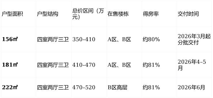 温馨提示 :目前主力户型 156–181㎡ 库存较充足,222㎡大平层为稀缺户型,建议优先锁定南向或中高楼层,采光与视野更优。