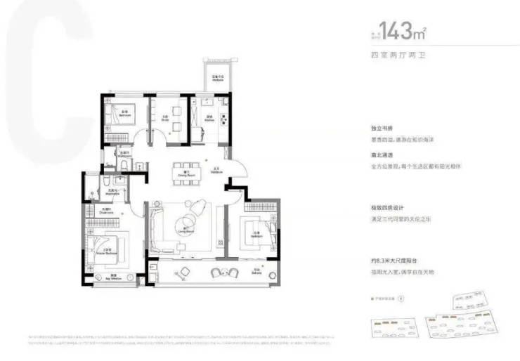 约143㎡四房之境,约12.3m南向三面宽,铺陈阳光与清风的偏爱;约8.3㎡开间的贯通式观景阳台,是家延伸向自然的取景框;主卧套房,衣帽间与独立卫浴自成天地;超3m进深U型厨房与独立玄关,将从容收纳于细节处尽显。每一寸,皆为仁恒对丰盛生活的精妙注解。