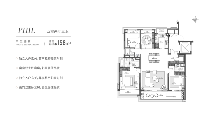 188㎡楼王户型:总价745万起,一梯一户独立玄关,约16.5米南向大面宽,客餐厨阳台无缝衔接,南向双主卧套房。