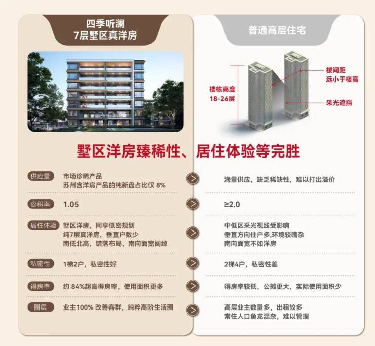 四季听澜以1.05 超低容积率打造纯粹低密社区,相比其他高层,四季听澜洋房业态优势碾压。