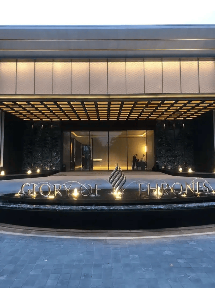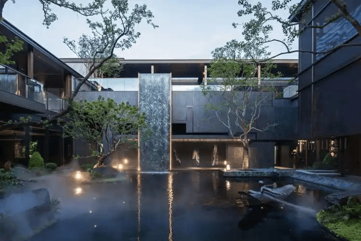 鎏光水院:约6.7m高飞瀑悬亭,酒店精奢安哥拉黑石材,定制一城显赫。