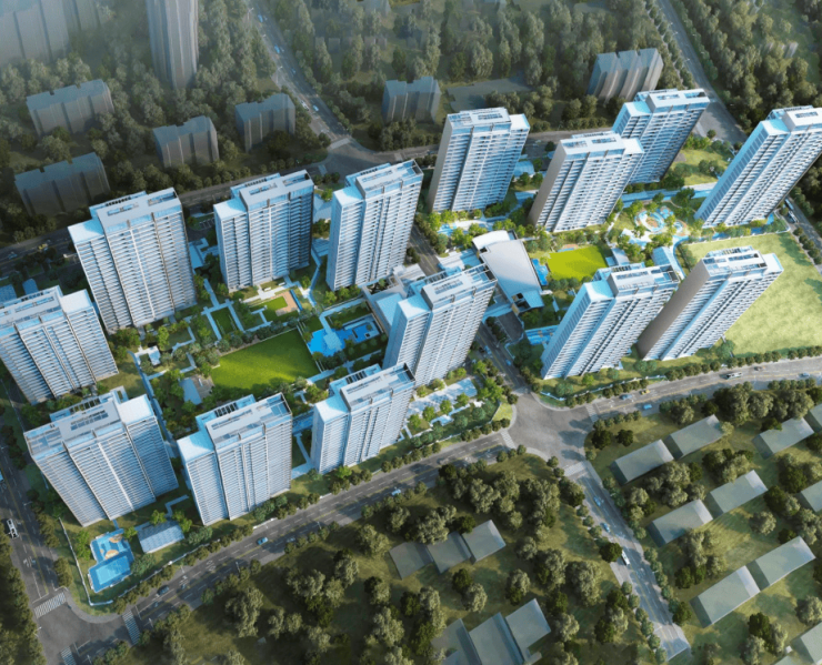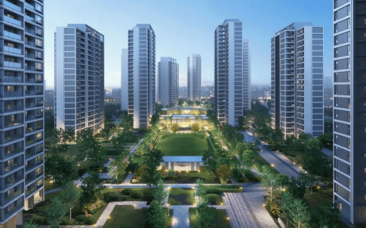 外立面采用陶瓷保温一体板+铝板,中央围合式布局,最大楼间距100米