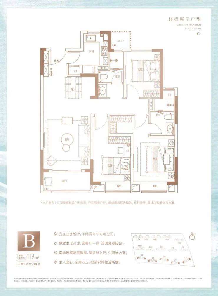 建面约119㎡户型,3房2厅2卫,户型三开间朝南、动静分离,南北通透。另外,户型设计了精致的生活动线,客餐厅一体,连通景观阳台;南向卧室均配置飘窗,引阳光入室;主人套卧、全屋双卫,提前安排生活所需,让业主的生活舒适度上升了一个层级!