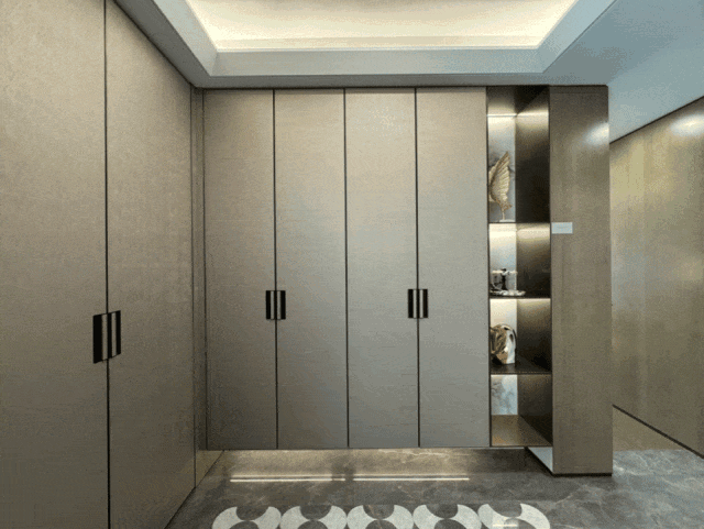 入户玄关有两组超大通顶收纳柜,钓鱼杆、宝宝推车、行李箱、鞋子等都能安排妥当;还在侧面增设了隐藏式800库。