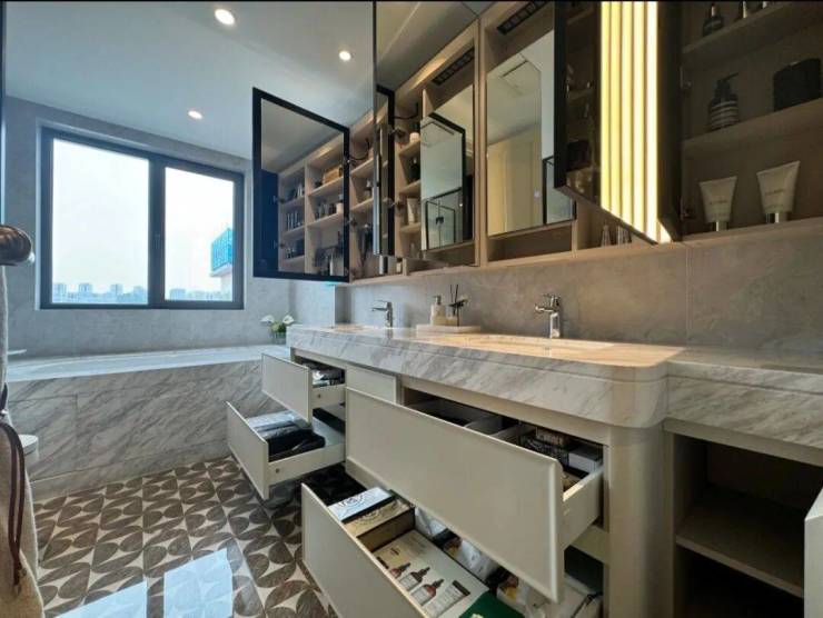 卫生间收纳空间也是做到了极致,内部设置壁龛,顶部长镜面柜的后面设计了收纳空间,台盆的底部还设计了抽屉空间,超级实用!