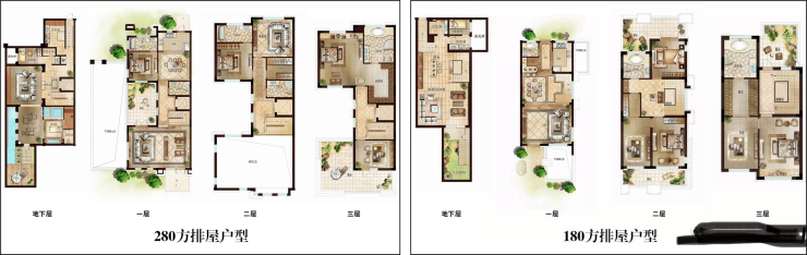 户型面积:建面约180、208、280㎡(地上三层,地下空间)