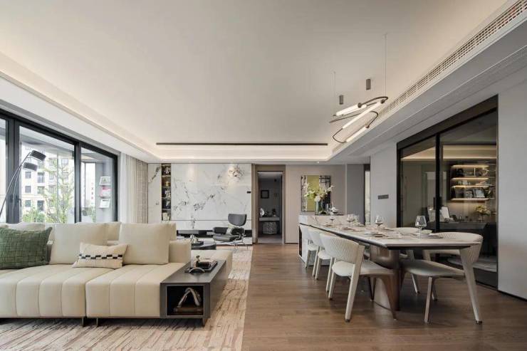 客厅是客人进入家门的第一观感,也是生活品质的体现。 建面约160㎡阔境洋房超50㎡恢宏双厅,刷新传统洋房格局,以约3.1m突破性层高、约7.6m巨幕开间,赋予室内更好的采光、通风效果和更开阔的视野。