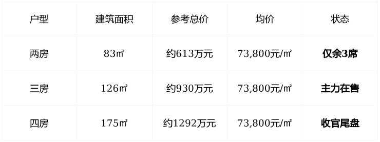 剩余房源 :仅剩 不足15席 ,主力户型已售超95%,进入“ 买一套少一套 ”清盘阶段;