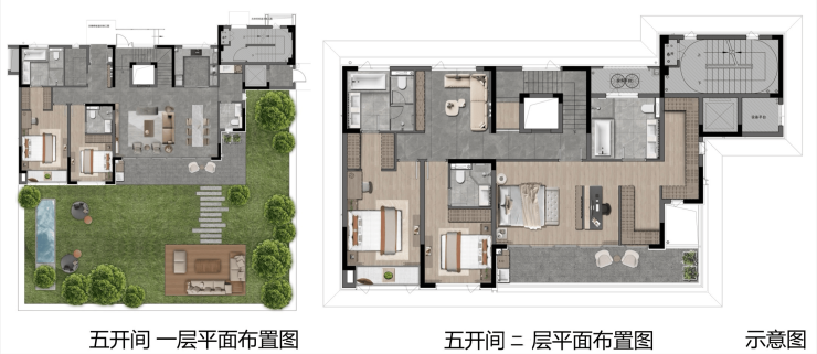 C户型:建筑面积约335㎡,4叠类独栋,5房6卫,独立南北入户,约17米大面宽、300㎡私家花园,全屋套房设计,私密性。