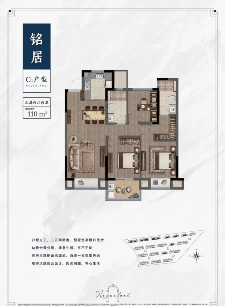 110㎡的三房两厅,相比上两个户型来的更为方正,三开间朝南,套房主卧带衣帽架,次卧难得拥有大阳台,采光效果可谓一流!