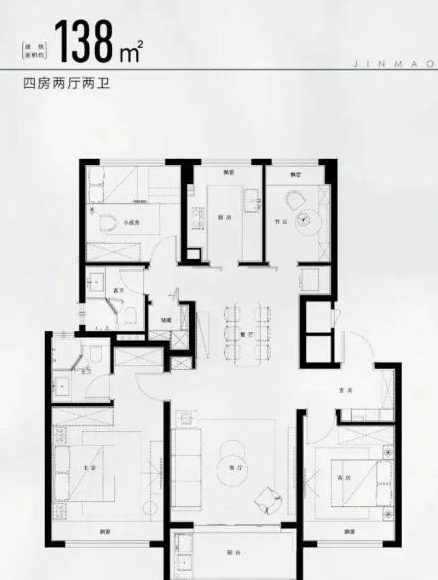 138㎡四房两厅两卫:四开间朝南,约7.2米宽景阳台,适配二胎或三代同堂家庭,总价约850-1000万