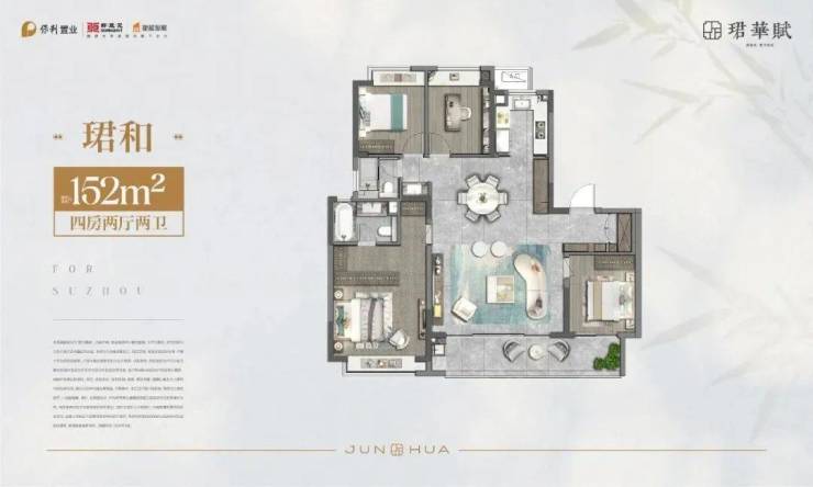 户型纯粹性:全系152-222㎡大平层,主力四房设计,其中190/222㎡户型采用双套房+家政间配置