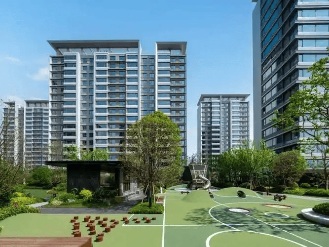 小区内:中央景观轴、亲子游乐场、活力跑道等“一轴十景四时园居”景观,绿化率35%,营造四季景观。