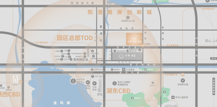自驾网络 :紧邻娄江快速路、星塘街、星湖街等主干道,15min直达苏州火车站,25min至园区湖西CBD,30min至上海虹桥枢纽。