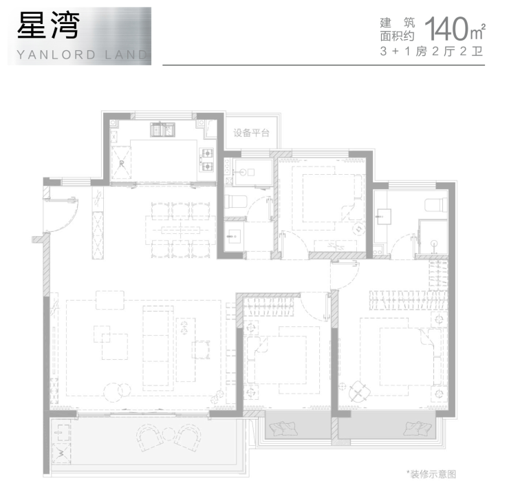 115㎡三室两厅横厅设计,1.8米观景阳台250-300万