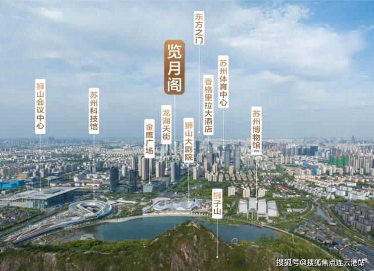 项目背靠狮山的高楼建筑群,东望如画姑苏,可远眺枫桥风景名胜区。天朗气清时,金鸡湖边的东方之门可直接映射到览月阁的窗前。城市东西两极,双峰并峙又互为窗景。