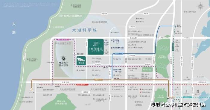 公共交通:项目周边公共交通网络十分发达。有轨电车 1 号线、2 号线与项目紧密相连,其中龙康路站距离项目约 1.1 公里,漓江路站约 1.2 公里,居民步行即可轻松抵达。这两条有轨电车线路如同区域交通的脉络,串联起科技城核心区域、苏州新区火车站等多个重要节点,与城市其他区域实现无缝对接。在项目周边 1 公里范围内,公交站点星罗棋布,如国际创新社区站距离项目仅 236 米,航船浜村站距离 741 米,科技城医院西站距离 761 米。63 路、336 路、3520 路、3521 路及支线等多条公交线路途经这些站点,满足居民日常通勤、购物、休闲等短距离出行需求。更为重要的是,根据规划,苏州地铁 9 号线、11 号线站点距离项目不远,其中 11 号线的庄里山北站距离项目约 600 米,龙康路站距离约 700 米。未来这两条地铁线路开通后,将极大提升区域公共交通的便捷性与时效性,居民乘坐地铁可快速通达苏州各主要城区,进一步缩短出行时间成本。此外,苏锡常城际铁路也规划途经太湖科学城,建成后将加强区域与无锡、常州等周边城市的联系,为居民城际商务出行、旅游等提供便利,促进区域协同发展,提升板块的交通枢纽地位。