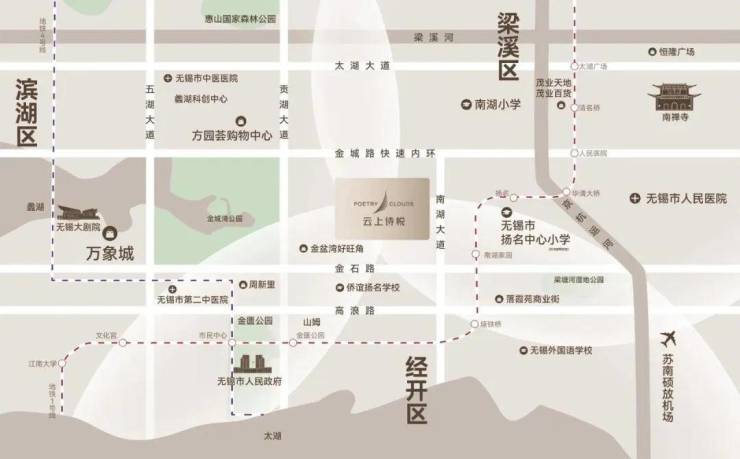先看大区位,项目位于梁溪区、滨湖区、经开区三区交汇处,从无锡主城区地图来看,正居黄金十字中心位,完全可以用六个字形容:老天爷赏饭吃。