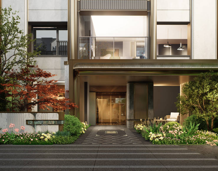建筑立面:采用"金镶玉"设计理念,融合石材、香槟金铝材及石库门经典建筑元素