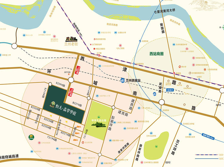 恒大翡翠华庭项目位于兰州市七里河高新产业园区彭家坪片区,项目毗邻七里河区较大的生态建设项目——中央生态公园;84-135㎡臻美户型,满屋名牌,9A精装装;项目自身配套有约30000㎡风情商业街、幼儿园以及约2500㎡综9会所;项目拥有金碧物业全程提供360度专业管家服务;项目周边有T210、B225、S216、T218、T219等多条市政规划路,离地铁一号线土门墩站以及西客站也是一步之遥。总建筑面积56万方,商住比1:21。