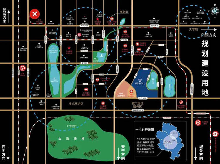 周边公园:珍珠湖、翠珠湖、西部恐龙园度假区、梅园生态园、中川牡丹园、万亩生态绿地、国家级农业示范展示区、兰州新区栖霞湖