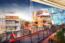 “欢乐谷”共有9栋楼,四大组团,其中1#、2#、3#楼为A组团,楼层为3层,业态规划明确,一层为品牌主力店、零售商业,二层为普通及非主流商业,三层为特色餐饮、风味餐厅。4#、5#、6#为B组团,其中6#楼为大型办公写字楼,共有14层,其余的均为商业主力店及小卖场。C组团有8#和9#楼,9#楼的第三层为康乐项目,四层及以上为酒店式公寓,其余的为品牌主力店和零售商业。7#楼独栋作为D组团,建筑四平八稳、中心突出、左右逢源,共有5层,地下负一层有大型停车场、四季泳池;1层为饮食类、零售商业;2层为大型综合百货;3层以少儿用品为主;4层为大型影院;5层为露天空中花园,不仅解决屋面空置,而且增添游乐空间和街区绿化。全方位空间利用,三大广场引入地标性建筑摩天轮、水上游艇、星际飞车、网红玻璃桥游乐等项目,极大的增添了整个商业区的人流气息,室内室外、楼内楼外、楼楼相连、层层相通、上下贯通、四通八达,为整个职教园区的师生及新区的民众生活提供了极大的便利。