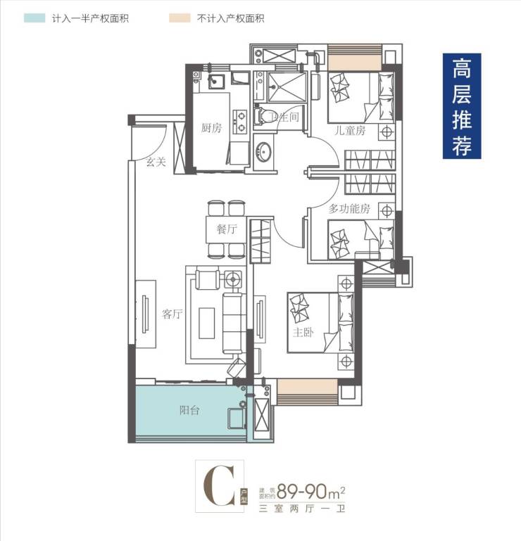 高层89平:三房两厅一卫