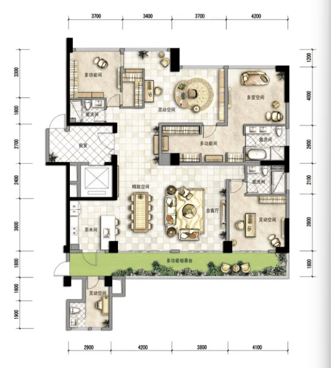 此面积段户型可根据不同楼栋与设计,呈现为 “4+1房3厅4卫”、“4+1房3厅3卫”或“3+1房4厅4卫” 等多种奢阔格局。其共同特点在于拥有约15米的巨幕采光面和约27㎡的观景阳台,空间感远超普通住宅。户型均预留保姆间位置,并支持套三、套四、套五的随心定制,以清水交付赋予业主最大的改造自由,完全满足多代同堂的家族居住、高端圈层社交或品质投资等多重需求。