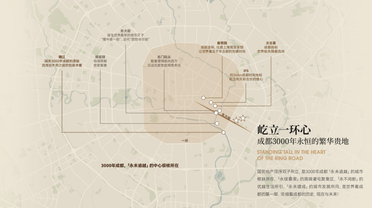 国贸地产双子所立之处,成都3000年永恒的繁华贵地,东大街一脉承续千年商脉与交子金融基因,集历史底蕴、金融核心、时尚封面与高端住区于一体,居住与收藏价值兼备。