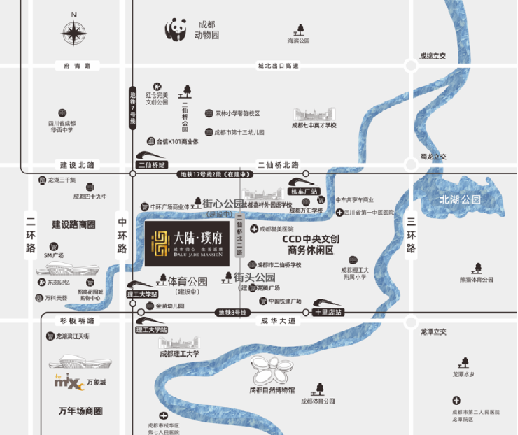 500M范围内,7/8号线交汇(理工大学站)7/17号线待建交汇(二仙桥站);三横三纵干道交通,六条主干道接驳全城。轨道/干道交通多重选择纵横全城