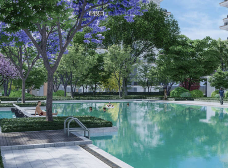 中庭生态的最中央用蓝花楹作为泳池景观排布,满足园区内多维度全龄活动功能场地,为业主打造2215㎡会所空间,由金钥匙团队专人管理,引入21种森林植物,充分去展现这种度假般的生活场景。