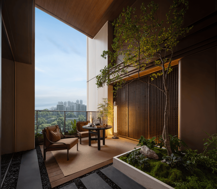 最大约7米层高的错层花园露台以"光影入庭,自然共生"为核心理念,特别设计约50cm降板,为空间赋予更多可能性。