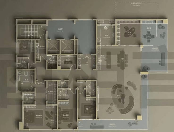 双主卧套房、独立家政动线、中西双厨及面向景观的阔绰家庭厅