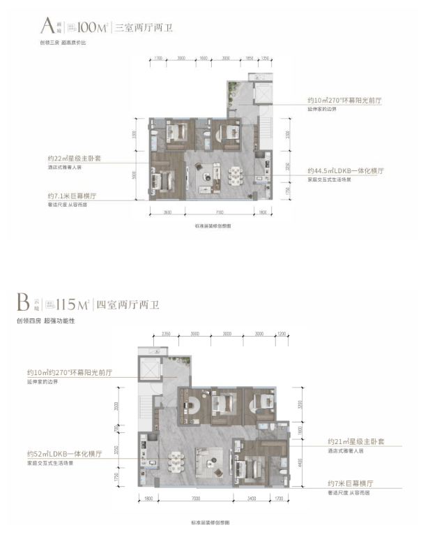 约115㎡则升级为功能四房,在紧凑面积内实现了房间数量的突破,空间利用率高,充分满足二胎家庭或需要独立书房空间家庭的居住需求。