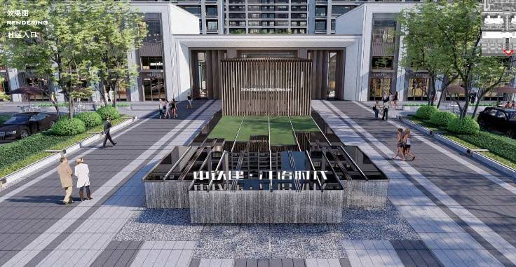 小区主入口位于中源大道主干道繁华商街中间。中国铁建打造礼遇式酒店入口,景观雨棚的设计,体现了轨迹的序列感。在前广场设计了近百米的礼仪水景,搭配着发光“中国铁建”醒目的LOGO,彰显归家仪式感。