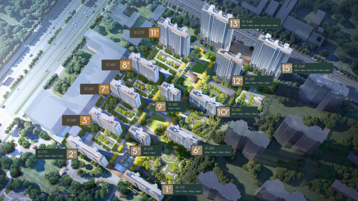 产品规划:共13栋,9栋17-18F小高层住宅,4栋27-34F大高层住宅 。