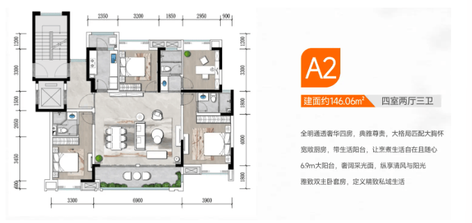 项目主力产品为建面约146㎡和180㎡的精装洋房,均采用创新的 “双套房” 设计及餐客厨一体化的LDK布局,以奢阔尺度和人性化细节,重塑高端家庭的居住体验。