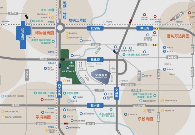 文景壹號项目位于文景头道街旁。临近哈尔滨市一环,与百年哈尔滨工业大学直线距离仅200米,地理位置优越。坐享多维立体交通及百年醇熟配套,聚集了城市政务发展、高端商业、文化中心、优质学府、一线医疗、金融资源等,打造科、教、文、卫、商精英生活圈。文景壹號项目是南岗一环内唯一在售的新房楼盘,位于主城区绝版土地位置,是可遇而不可求的高品质改善人居大盘,在壹环繁芯中的稀缺纯粹住宅区域,缔造纯粹高阶居境,周边无不利因素,城芯难得静谧之处,稀缺产品与绝版地段加成,具备更强的保值、增值性。