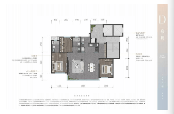 此户型为项目的旗舰产品,分布于17层小高层,2梯2户。四房两厅两卫的格局,充分满足了多人口家庭或需要独立书房、兴趣空间的高净值人群需求,尺度阔绰,彰显大家风范。