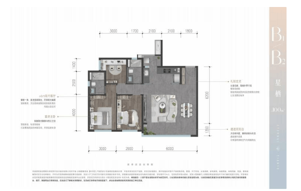 建面约100㎡三房两卫 (B1/B2户型)