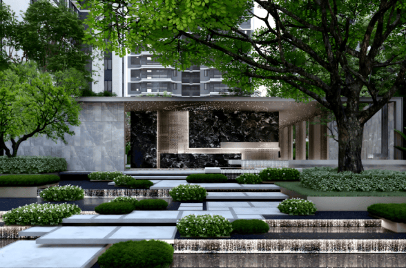 以曼谷瑰丽酒店为灵感,项目衍生出一环两轴四花园的高奢度假式景观体系:
