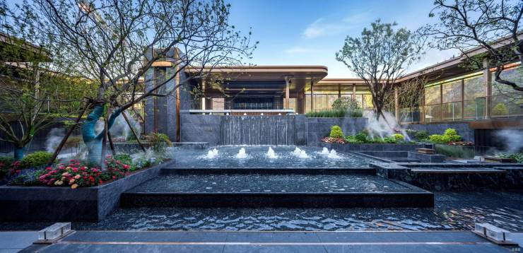 艺术双轴礼序主入口礼仪轴打造下沉式酒店社区大堂、立体山水园景,和临街城市界面浪漫烟火街区,实现可游、可赏、可停的生态漫行归家之旅。